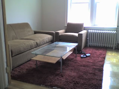 The couch is long enough to pass out on after stumbling home at 4am and if I ever want to sit by the window and page through the latest copy of Hustler, there's a lovely chair by the window as well. Not to mention the highly shaggable shag rug and my coffee table that looks like it was designed by Powell-Peralta.
